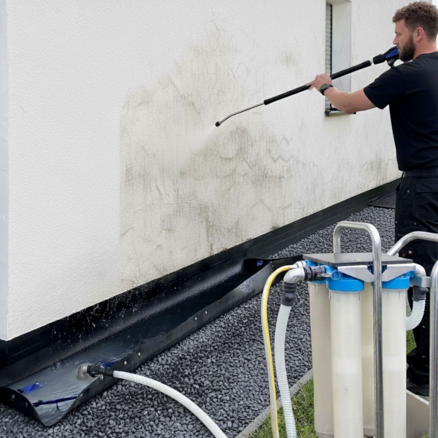 Technik: Einsatz von Speziallanzen (bis zu 10 Meter Höhe) und umweltschonenden Abwasser-Auffangsystemen.